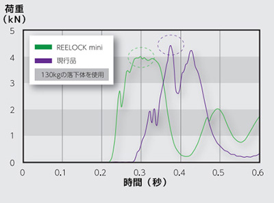 左のグラフは、JIS T 8165:2018「8.3.6ロック装置付き巻取式ランヤードの耐衝撃性 試験」の結果です。試験には130kgの落下体を使用しています。